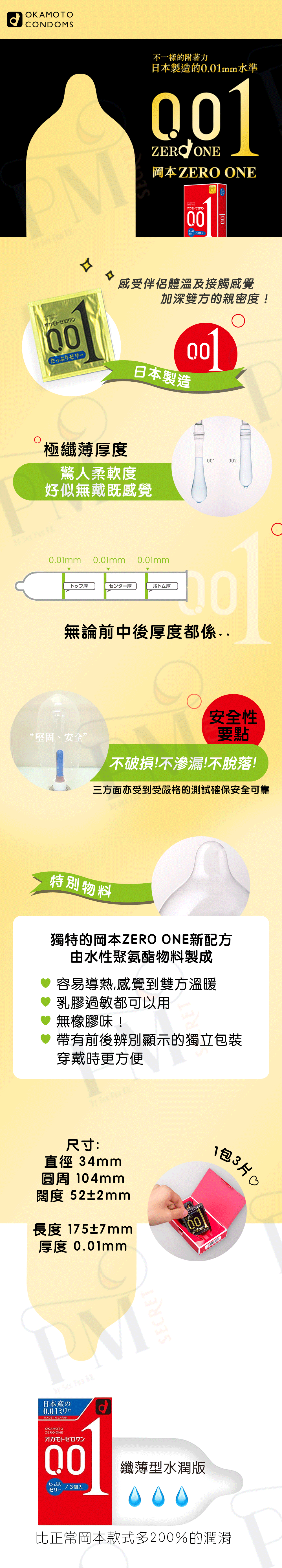 O K A M O T O・001 極薄水潤版 PU 安全套 - 3 片裝