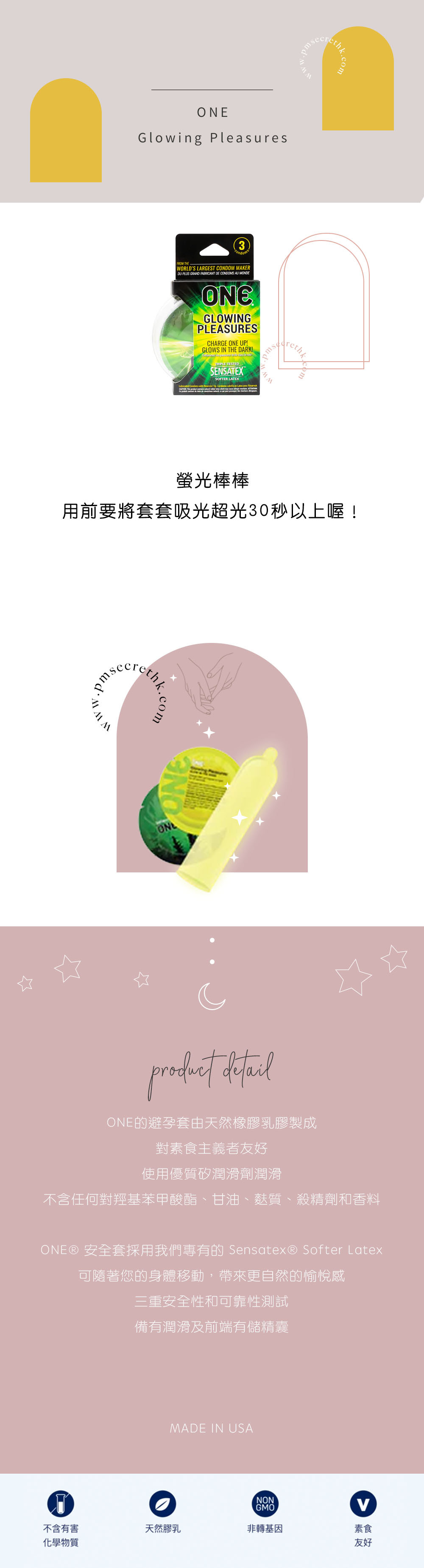 O N E・Glowing Pleasures 夜光乳膠安全套 - 3 片裝